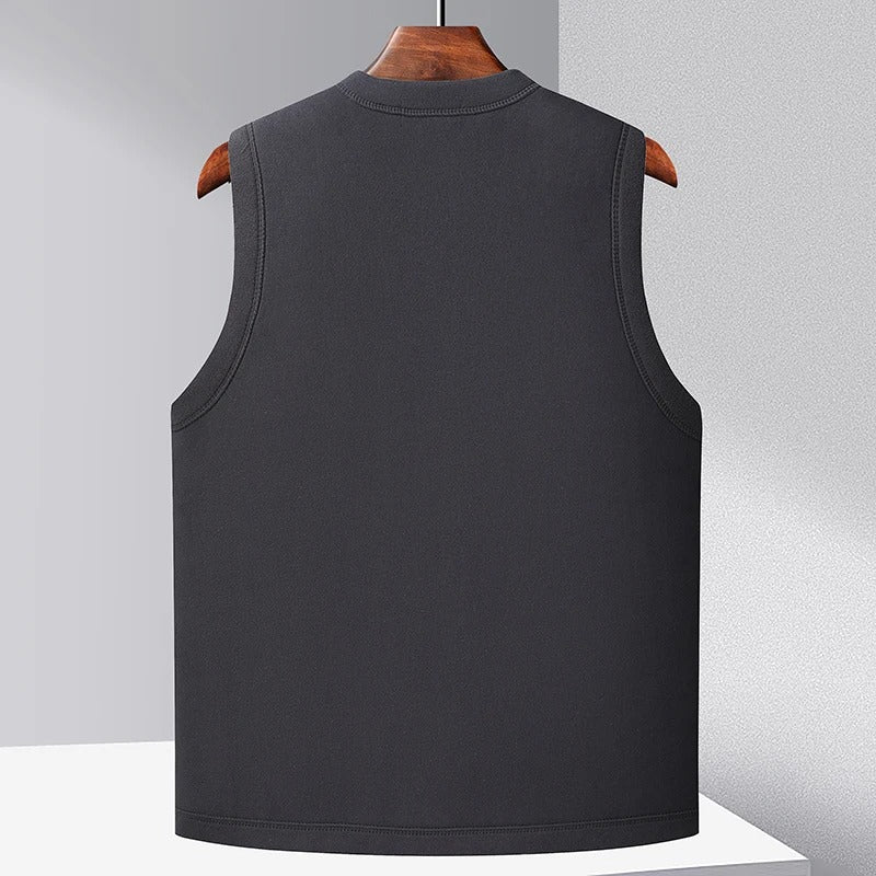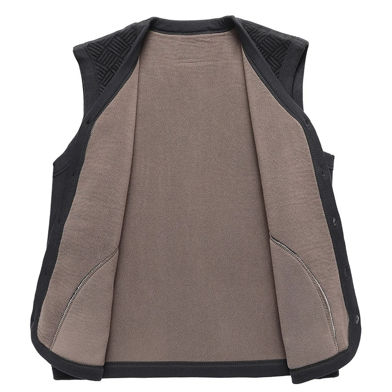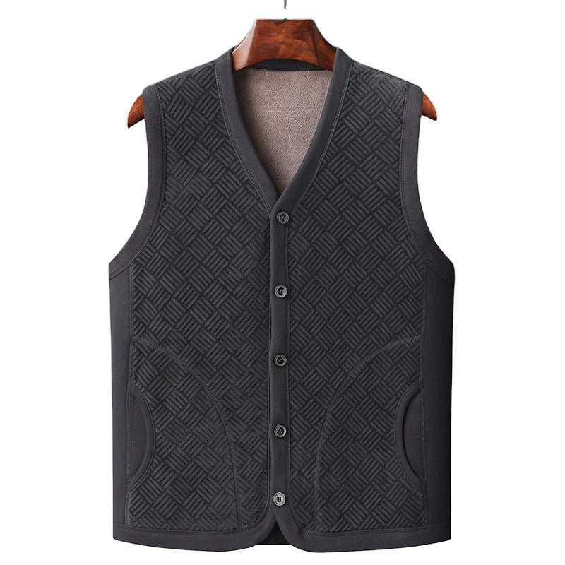 Ce gilet sans manches pour homme est réalisé dans une teinte foncée et présente un motif matelassé en losanges sur l’avant. Le modèle est doté d’un décolleté en V, d’une rangée de boutons sur le devant et de deux poches arrondies. L’intérieur est uniformément fini et adapté pour être porté sur différents vêtements.