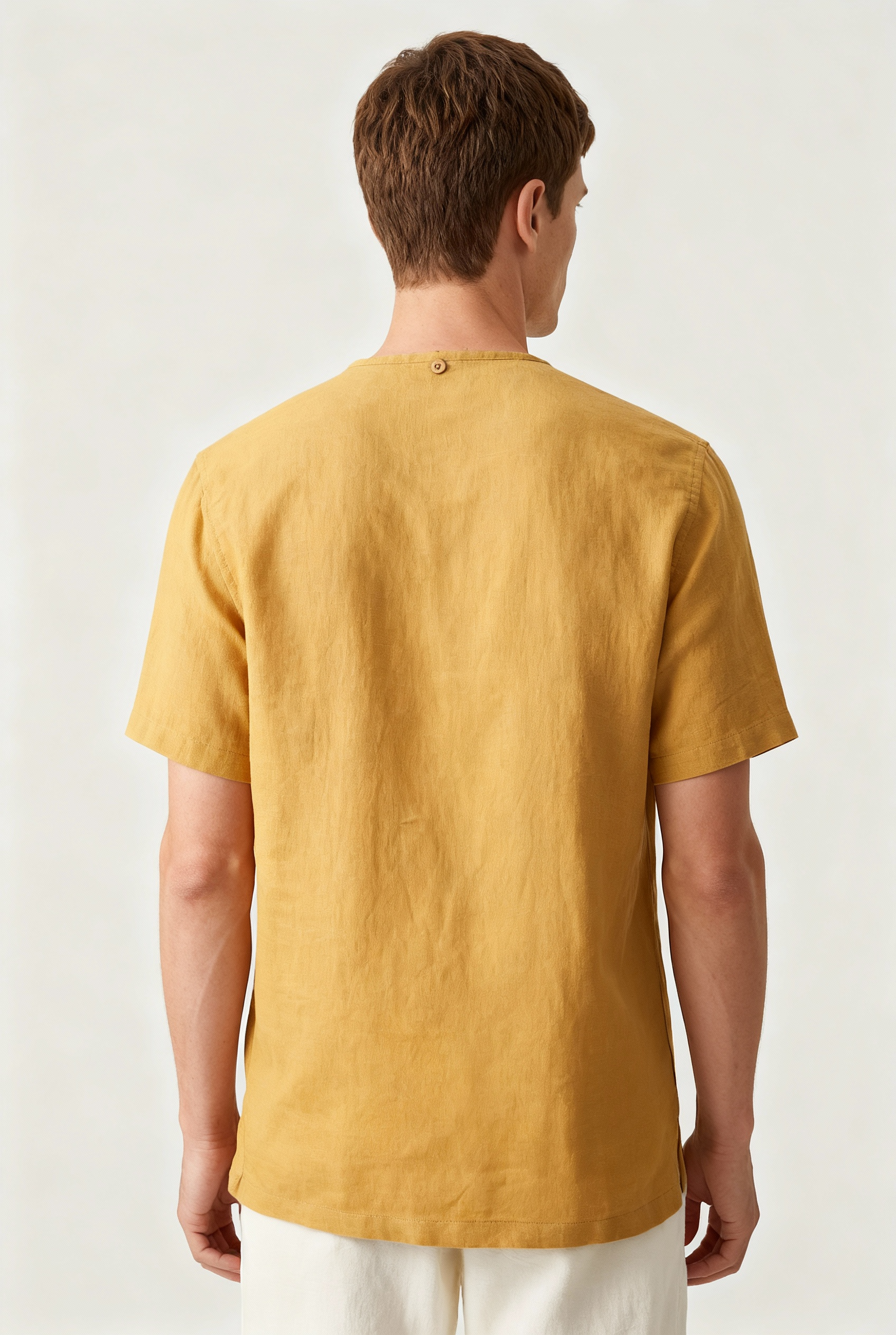 Ce T-shirt pour homme est réalisé dans une teinte ocre et présente une encolure ronde avec une courte patte de boutonnage à l’avant. Le modèle est doté de manches courtes et d’une coupe droite. Le tissu possède une structure légèrement tissée et uniforme.